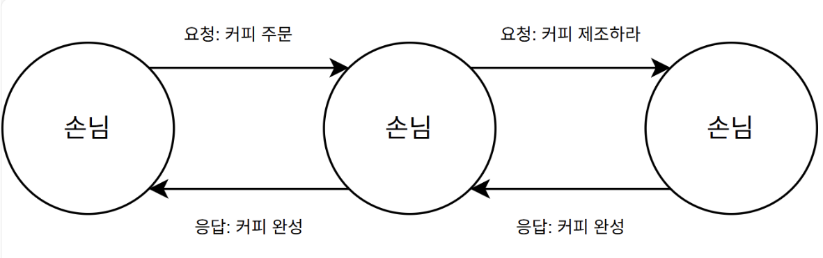 - 사람이라는 단어를 객체로, 에이전트의 요청을 메시지로, 에이전트가 요청을 처리하는 방법을 메서드로 바꾸면 커피를 주문하는 과정은 대부분의 설명을 객체지향이라는 문맥으로 옮길 수 있다.
