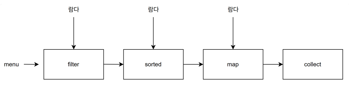 - filter, sorted, map, collect 같은 여러 빌딩 블록 연산을 연결해서 복잡한 데이터를 처리하는 스트림 파이프라인을 만들 수 있다.