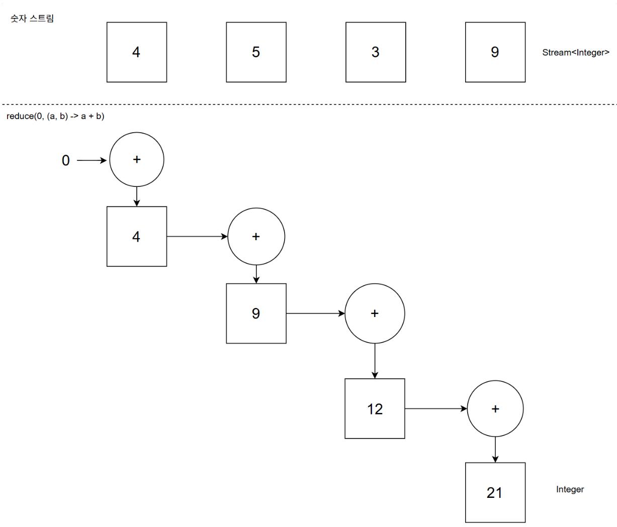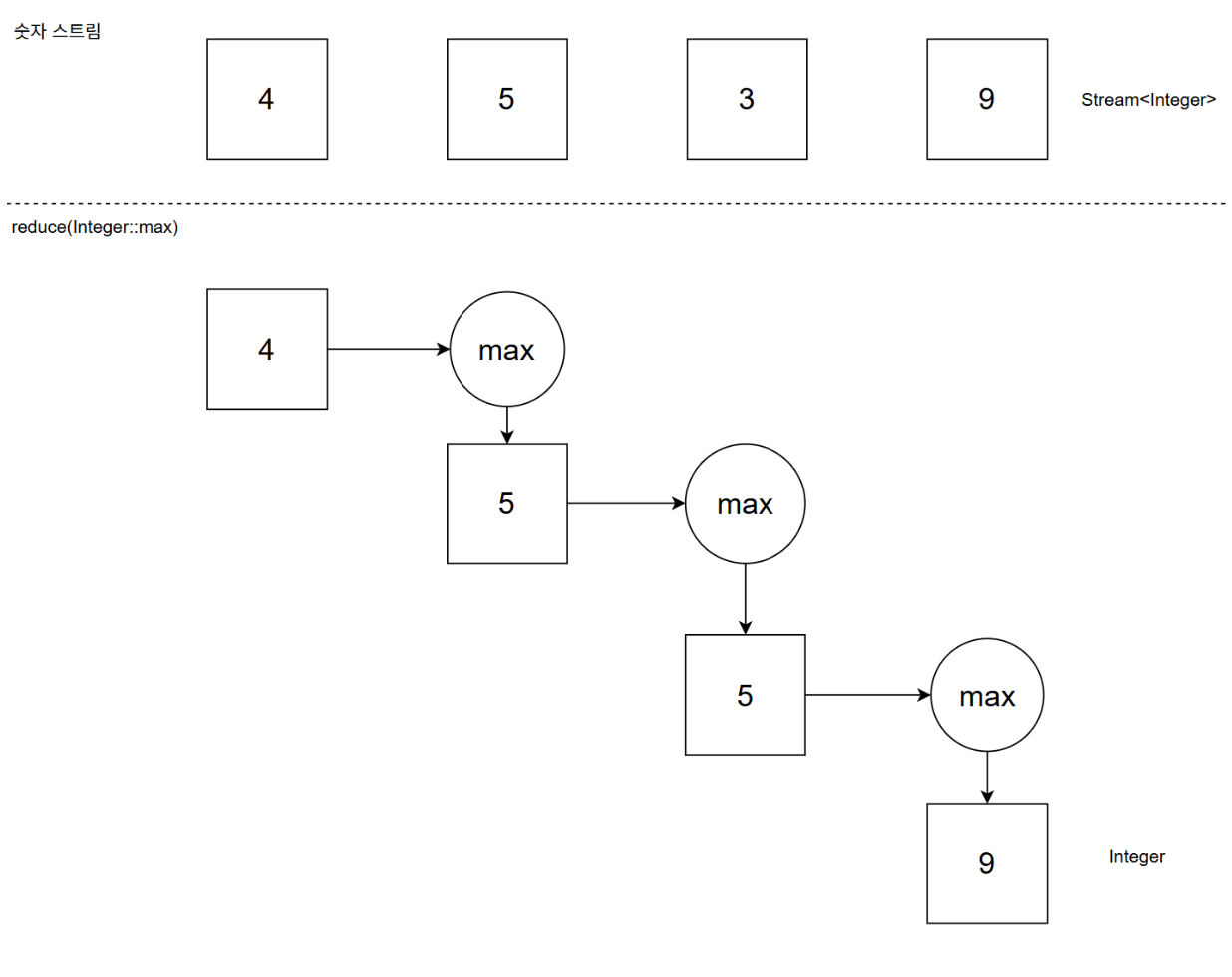 reduce 메서드로 스트림의 모든 요소를 반복 조합하며 값을 도출할 수 있다.(Optional 반환)