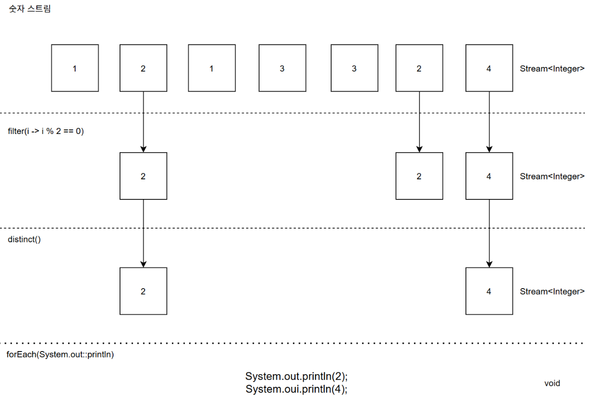 sorted나 distinct 같은 연산은 filter나 map과 같이 스트림을 입력으로 받아 다른 스트림을 출력하는 것처럼 보일 수 있으나 스트림의 요소를 정렬하거나 중복을 제거하려면 과거의 이력을 알고있어야 한다. 즉, 내부 상태를 갖는 연산인 것이다.