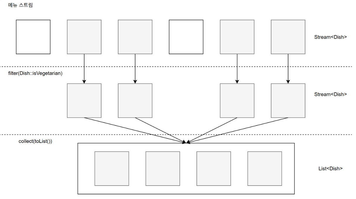 filter, distinct, takeWhile, dropWhile, skip, limit 메서드로 스트림을 필터링하거나 자를 수 있다.