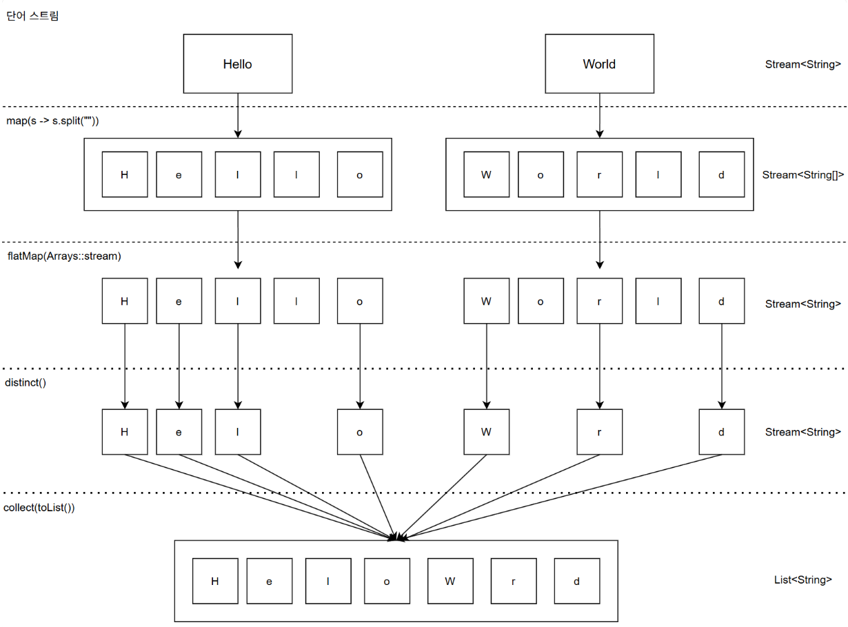 위 코드는 문자열 배열을 구성 요소로 하는 스트림의 각 구성 요소인 문자열 배열 하나씩만을 Arrays.stream 메서드의 인자로 넣어주기 때문에 스트림의 구성 요소 하나씩만에 대한 문자열 스트림(Stream<Stream< String >>)을 만들어내게 되어 제일 처음 스트림에 대한 평면화를 하지 못한다.