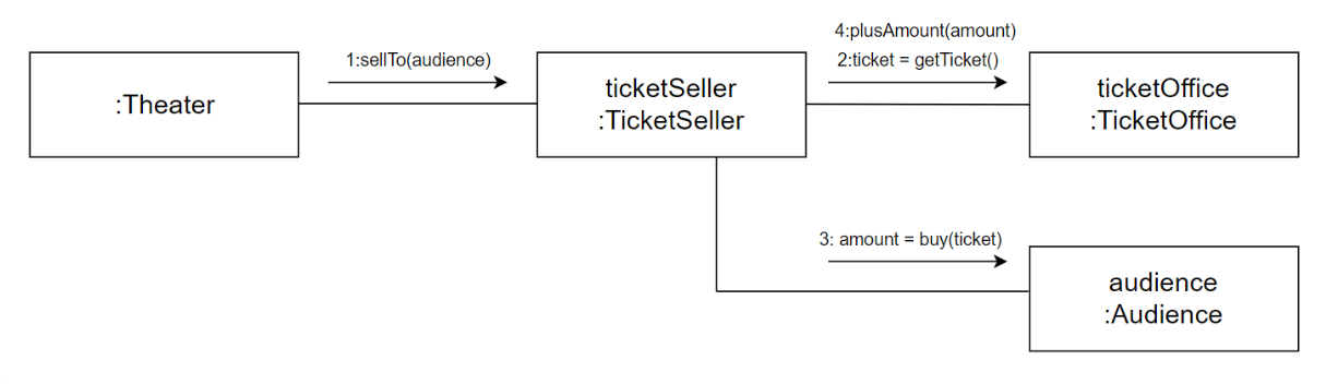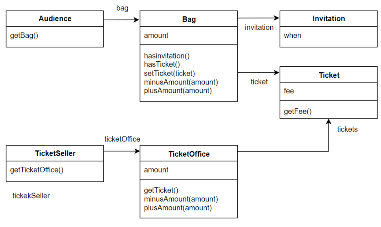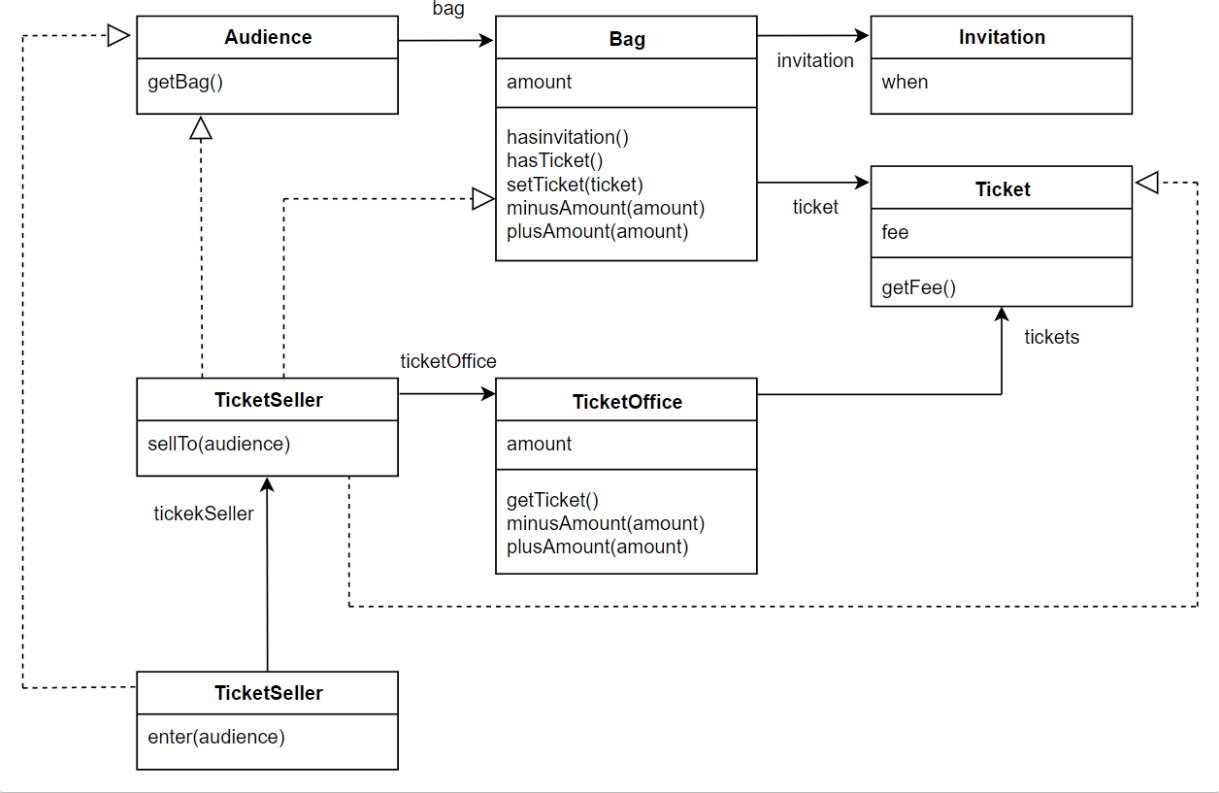 - 판매원을 구현한 TicketSeller 클래스는 자신이 일하는 매표소(ticketOffice)를 알고 있어야 한다.