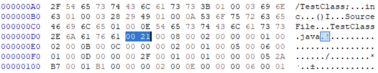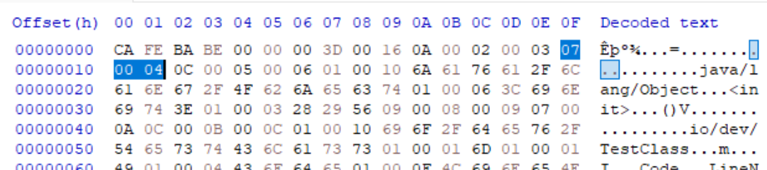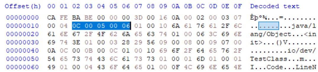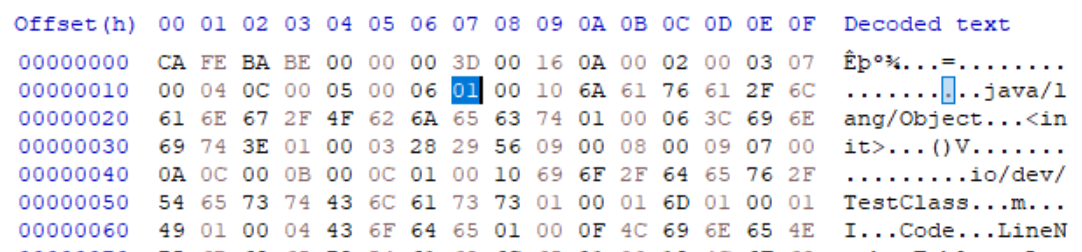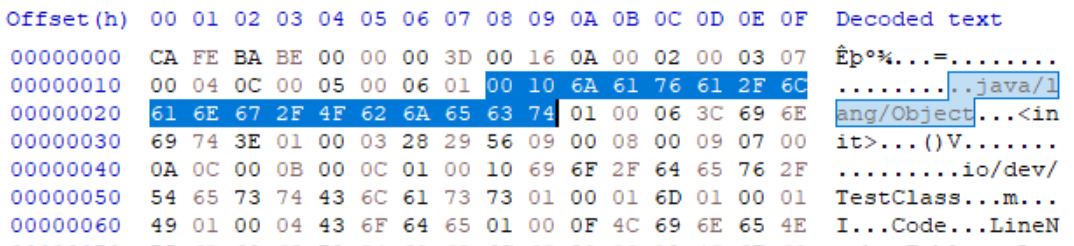 클래스 이름이 되는 문자열의 길이(오프셋 주소: 0x00000018)는 0x0010, 즉 16바이트다. 이어지는 16바이트는 모두 아스키코드로 1~127 범위에 있으며, 값은 "java/lang/Object"다.
