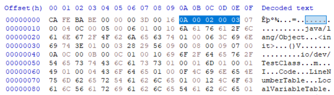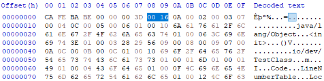 십육진수 3D는 십진수로 61이다. 이 버전 번호로부터 이 클래스 파일은 JDK 17 이상의 가상 머신에서 실행할 수 있음을 알 수 있다.