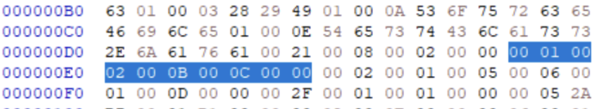 추적하는 과정에서 클래스의 이름(상수 풀에서 네 번째 상수 데이터 구조 안), 메서드 이름(상수 풀에서 다섯 번째 상수 데이터 구조 안), 메서드 타입(상수 풀에서 여섯 번째 상수 데이터 구조 안) 정보는 모두 플래그 비트가 0x01로, UTF-8로 인코딩된 문자열로 표현된다.
