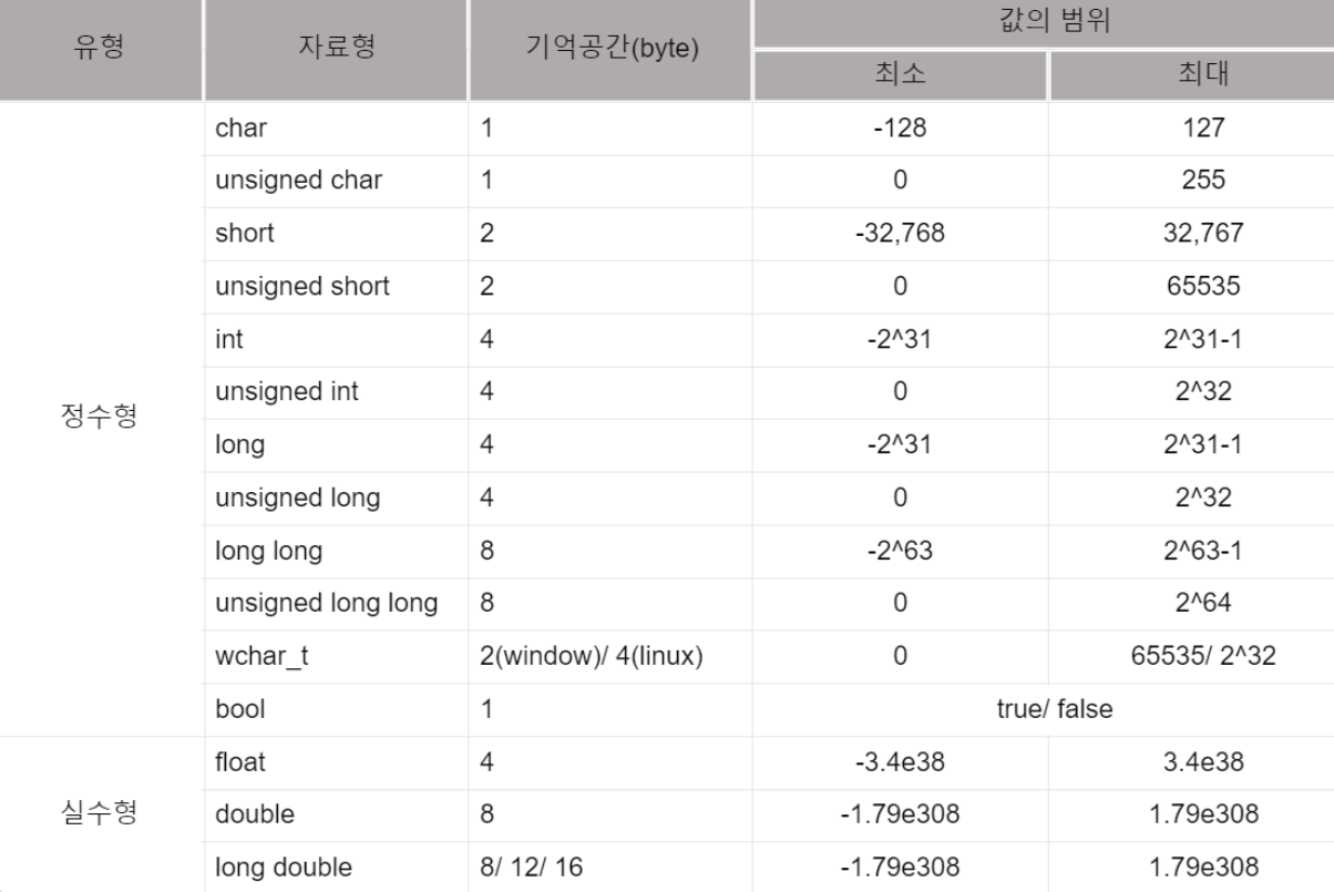 C++의 기본 자료형은 고정소수점 표현 방식인 정수형 자료형과 부동소수점 표현 방식인 실수형 자료형으로 분류할 수 있다.