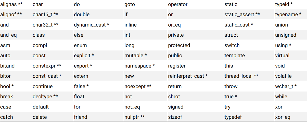 식별자의 첫 글자는 비숫자 문자를 사용할 수 있다. 비숫자 문자에는 영문 대소문자, 밑줄 문자 ('_')가 포함되며, C++11부터 다국어 문자도 포함된다.