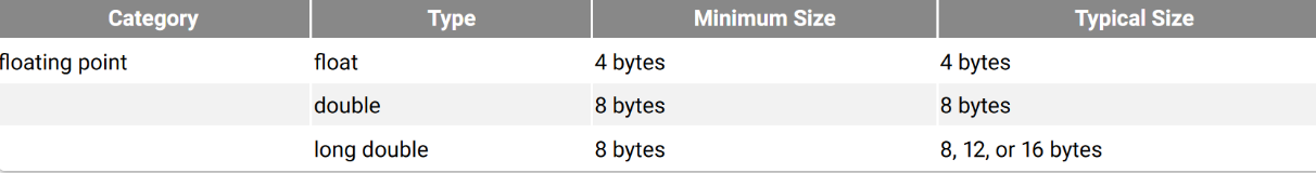 현대 아키텍처에서 부동 소수점 표현은 거의 항상 IEEE 754 바이너리 형식을 따른다. 이 형식에서 float은 4 byte이고 double은 8 byte이며 long double은 8, 12, 16 byte 중 하나다.