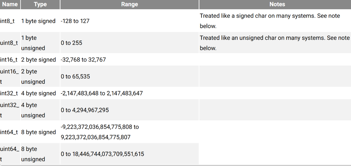 int8_t와 uint8_t는 각각 char와 unsigned char와 같이 동작할 수 있지만 시스템에 따라 다르게 동작할 수도 있다 => int8_t와 uint8_t 사용은 자제