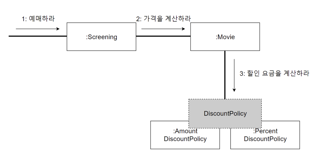 - AmountDiscountPolicy 인스턴스와 PercentDiscountPolicy 인스턴스라는 두 가지 종류의 객체가 할인 요금을 계산하라라는 메시지에 응답할 수 있어야 한다.