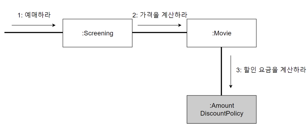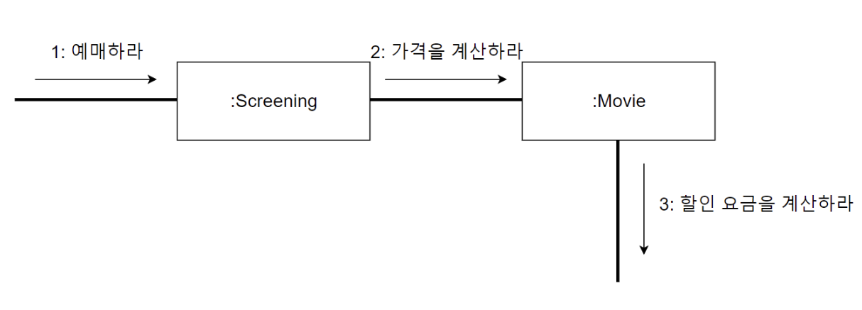 - Movie가 가격을 계산하기 위해서는 할인 요금이 필요하다. Movie느 할인 요금을 계산하라라는 메시지를 전송해서 외부의 객체에게 도움을 요청