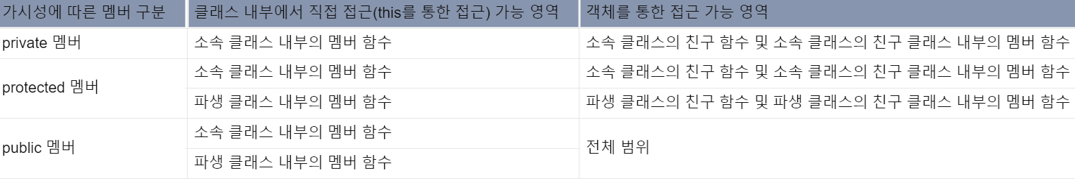 - 이것은 파생 클래스에 상속된 기초 클래스의 멤버가 파생 클래스에서 어떠한 가시성을 갖게 되는가를 제한하는 것으로, public, protected, private 중 하나를 사용할 수 있다.