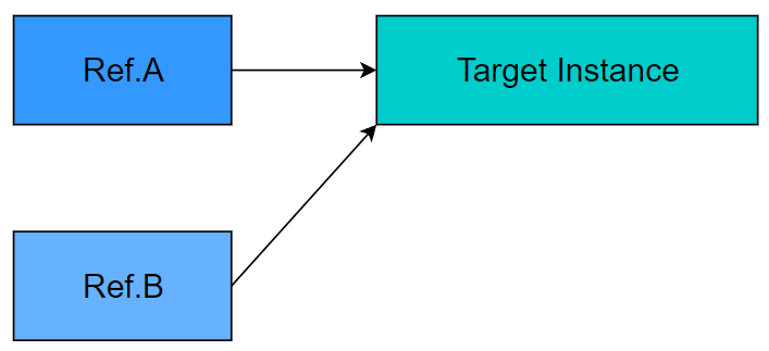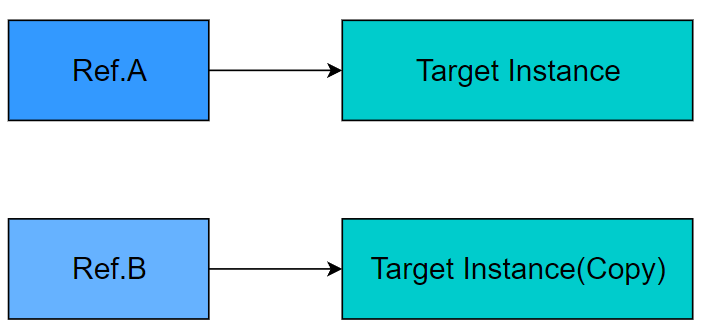 여러 참조자가 하나의 인스턴스를 공유하게 된다. => 공유하는 하나의 인스턴스 상태를 변경 시 변경으로 인한 영향이 전파된다.