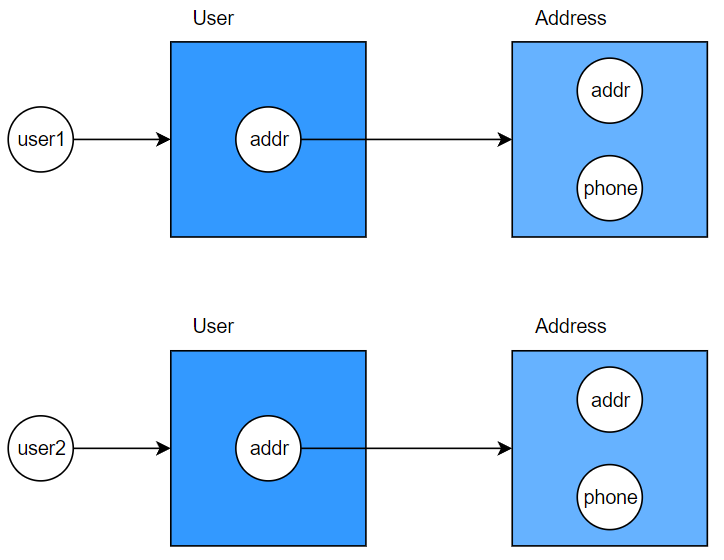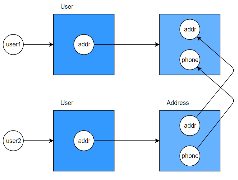 그렇기 때문에 user2.getAddress().address = ..., user2.getAddress().phone = ...로 user2의 addr이 참조하는 인스턴스의 내용을 변경하면
